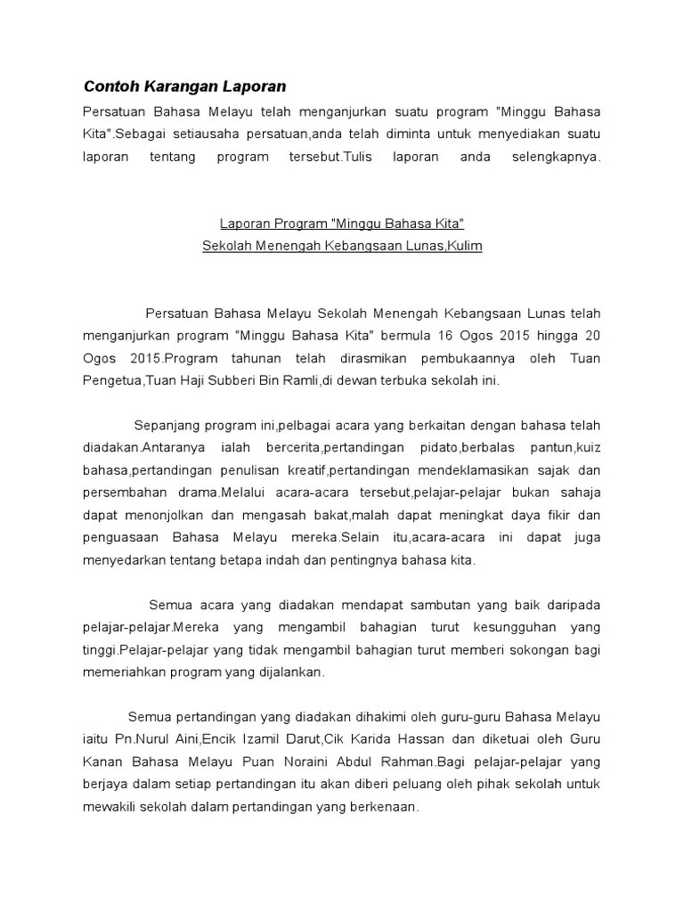 Laporan berformat tertentu merujuk kepada setiap organisasi telah mempunyai format laporan tersendiri dan perlu diisi di dalam borang. 10 contoh karangan jenis laporan ini khas untuk murid. Sempena kempen ini, pelbagai acara menarik telah dijalankan. Format karangan laporan bm thn 5 6. Contoh karangan laporan lawatan sambil belajar spm rasmi v. Contoh soalan kbat tahun 5. Myguru merupakan portal pembelajaran yang dibina selaras dengan keperluan silibus pelajar tahun 1 hingga tingkatan 5. Related posts to contoh laporan gotong .